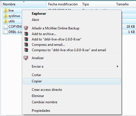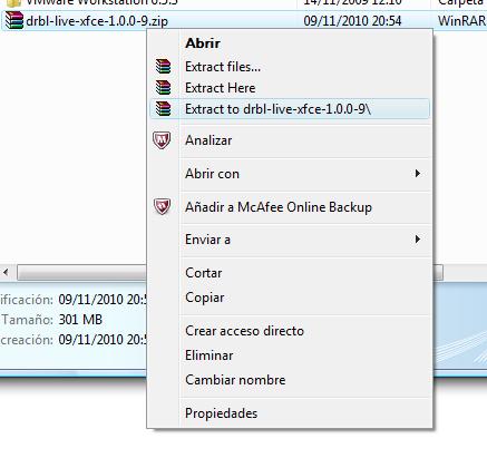 Una vez descargado el fichero con la extensión ZIP lo descomprimiremos dentro de una carpeta. En mi caso tengo instalado el programa WinRar para tal efecto. De este modo entro en "Mi PC" busco el fichero lo selecciono con el botón derecho del ratón y clico en "Extract to drbl-live-xxfce-1.0.0.9\" de este modo me aparecerá una carpeta con ese nombre "drbl-live-xxfce-1.0.0.9", dentro de la cual estará el sistema operativo.