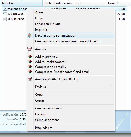 Dentro de esta carpeta se encuentra el archivo por lotes makeboot.bat, un archivo por lotes es un archivo que se prepara para ejecutar una serie de instrucciones automáticamente. Lo ejecutaremos con permisos de Administrador.