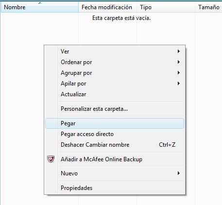 Luego vamos al usb nuevo que tenemos, sin ningún archivo y le damos a pegar.