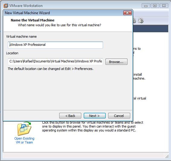 En la siguiente ventana se introducirá el nombre con el que reconoceremos la máquina virtual, por defecto será Windows XP Profesional, de momento este nombre es adecuado, si se tuvieran que tener varias máquinas virtuales con windows XP Profesional se deberia indicar un nombre más descriptivo para poder diferenciarlas. Tambien se tiene que indicar donde se guardará esta máquina virtual, se clicará en Browse y se buscará el Pendrive, una vez seleccionado se pulsará aceptar. Y a continuación Next.
